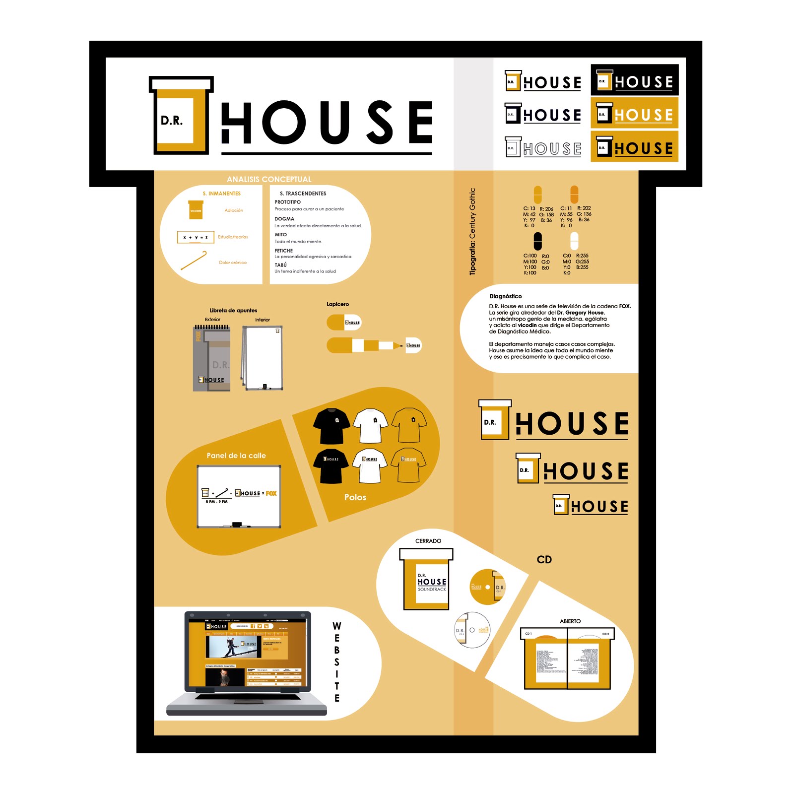 Dr. House. Bueno tras el detallado estudio de la serie, los significados inmanentes, la paleta de colores y la realización del brief, fue que se diseño un nuevo Isologo de la serie mencionada. En el Isologo se observan dos puntos importantes, la tipografía (century gotic) que se mantuvo igual a la original, y el isotipo, que es una síntesis de un frasco de Vicodina con etiqueta de DR. La Vicodina, tras el estudio se encontró como un elemento muy importante, pues el protagonista,
